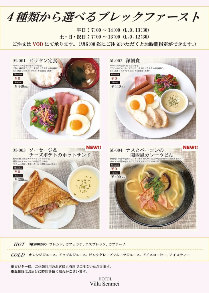 定番のビラ定・洋朝食メニューはそのままに、「ソーセージ&チーズポテトのサンド」「ナスとベーコンの関西風カレーうどん」が新たに加わりました。ぜひご賞味くださいませ。皆様のご来店を心よりお待ちしております。